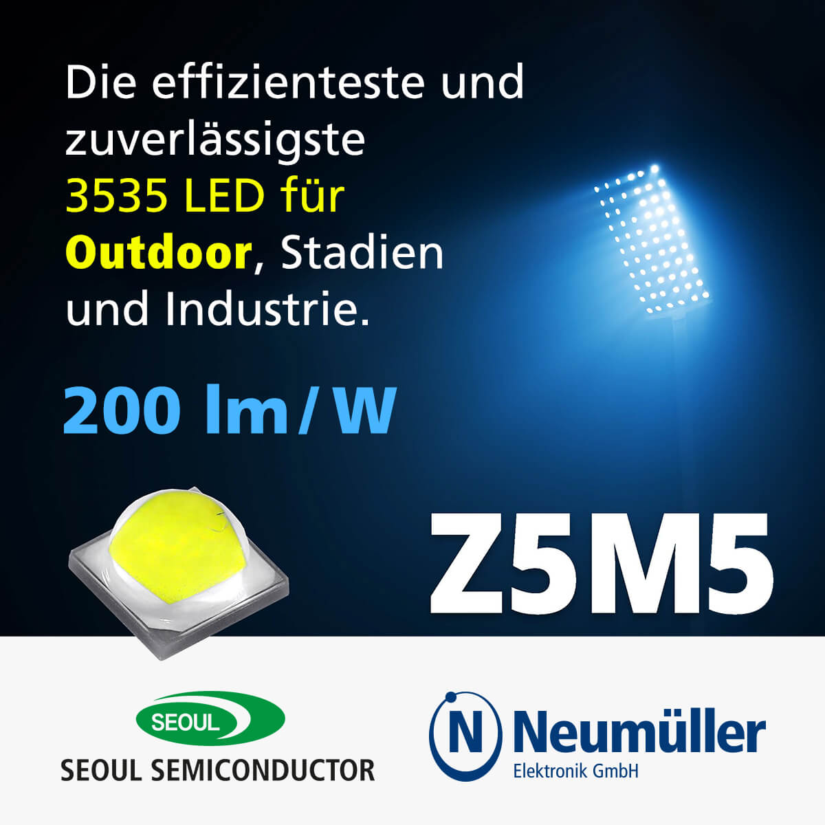 Seoul Semiconductor hat sein Portfolio um die Z5M5 erweitert, eine neue High-Power-LED im 3535-Design mit WICOP-Technologie und einer herausragenden Lichtausbeute von bis zu 200lm/W. Das für die Z5-M5 speziell entwickelte LED-Gehäuse enthält die neueste Chip-Technologie von Seoul Semiconductor und punktet mit höchster Effizienz und Zuverlässigkeit. Die Z5M5 ist eine Lichtlösung, die dem Zahn der Zeit trotzt und eine gleichbleibende Leistung und Haltbarkeit gewährleistet.